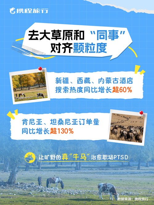 此外,国内游客也将目光投向更遥远的非洲地区。肯尼亚和坦桑尼亚的假期订单同比增长130%,前往观看动物大迁徙的Safari深度玩法亦被游客笑称为“远赴非洲看‘外国牛马同事’”。