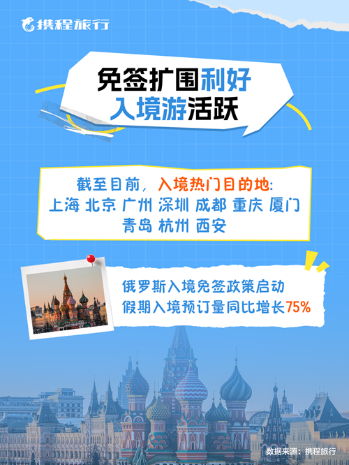 值得注意的是,近期中俄互相免签政策推动俄罗斯游客来华热情上升。截至目前,本次假期俄罗斯旅客入境预订量同比增长75%,游客偏好的目的地包括北京、上海、三亚、广州、哈尔滨等。