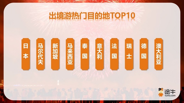 出境游热门目的地中,日本、马尔代夫、新加坡、马来西亚、泰国、意大利、法国、瑞士、德国、澳大利亚等是截至目前途牛用户的热门选择。