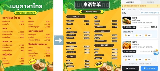 左边为泰语菜单,右边为马蜂窝翻译的菜单和生成的参考图片